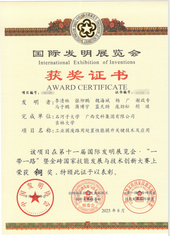 2025年8月24日,由中国发明协会、金砖国家工商理事会中方理事会、广州市协作办公室共同主办的第十一届国际发明展览会暨“一带一路”暨金砖国家技能发展与技术创新大赛上,由色情网站 、广西交科集团有限公司、吉林大学联合研发成果“工业固废路用处置性能提升关键技术及应用”从众多参赛项目中脱颖而出,荣获铜奖。
